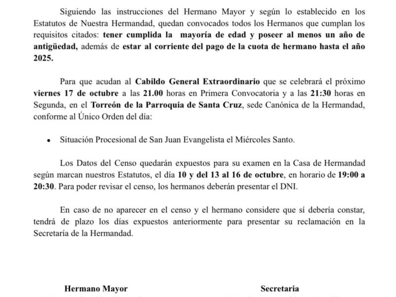 Comunicado oficial – Cabildo extraordinarioEl próximo viernes 17 de octubre trataremos junto a nuestros hermanos la situación procesional de San Juan Evangelista el Miércoles Santo.Recordamos
